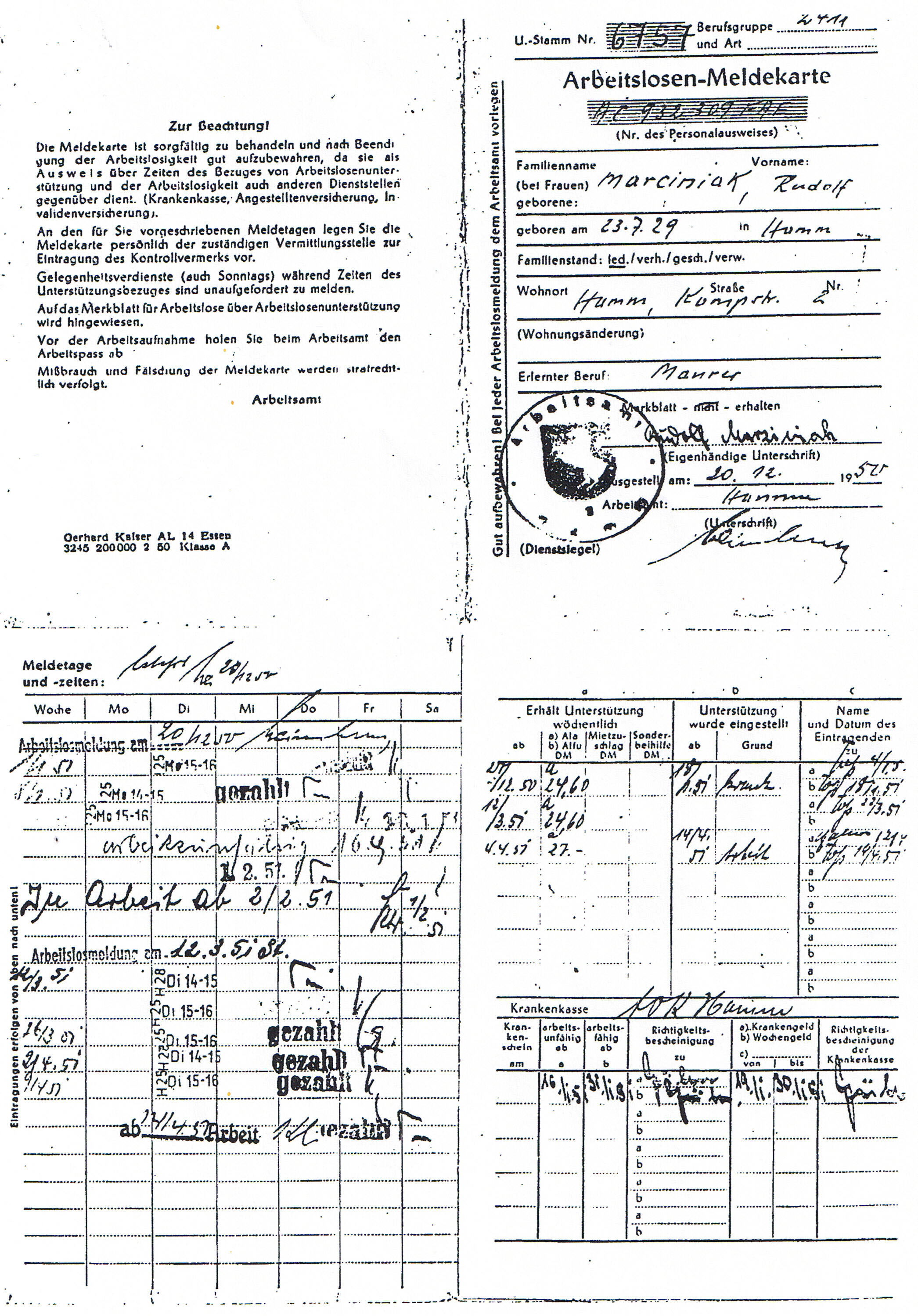 Hamm bekam ich ab 07. Januar 1949 eine Arbeit als Grubenmaurer bei der