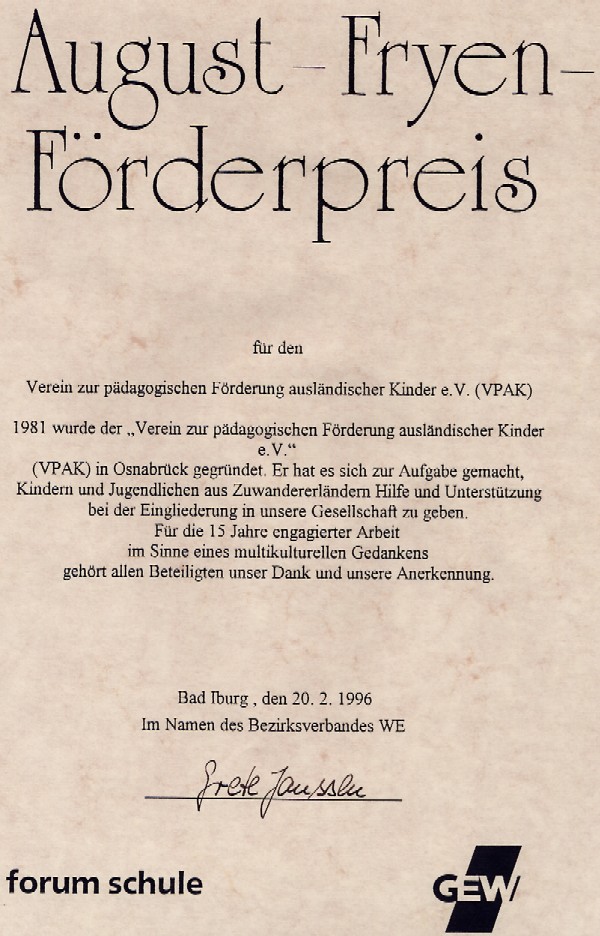 1996 erhielt der VPAK der August-Fryen-Preis von